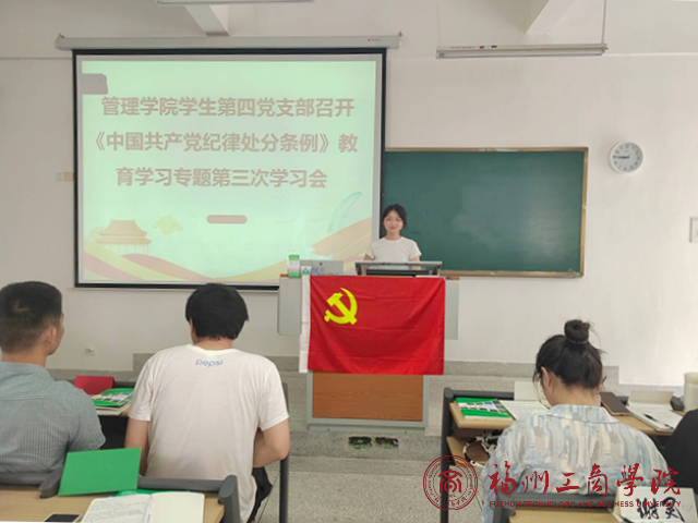 为进一步深入学习领会《中国共产党纪律处分条例》,引导广大学生党员牢固树立党规党纪意识,坚守纪律底线。5月29日下午,ok138cn太阳集团学生第四党支部在教学楼D102召开《中国共产党纪律处分条例》教育学习专题第三次学习会。此次会议由支部书记杨心如主持,全体学生党员出席。