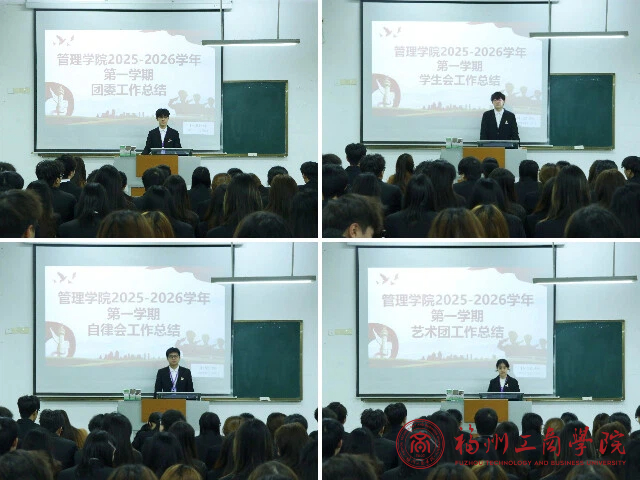 会议伊始,各团学组织负责人依次作工作总结汇报。团委副书记林嘉宏率先汇报ok138cn太阳集团团委本学期工作,从团务建设、活动开展、组织协作等方面,系统梳理了团委的工作成效与待改进之处;紧接着,学生会主席陈俊楠总结学生会工作,围绕服务同学、校园活动策划、学生权益保障等核心职责,展现了学生会的履职成果;自律会主任吴博铨随后汇报自律会工作,聚焦校园纪律监督、日常管理规范等工作重点,分析了工作中的亮点与短板;艺术团负责人钟颖最后分享艺术团本学期工作,通过各类文艺活动的开展情况,展现了学院校园文化建设的鲜活成果。