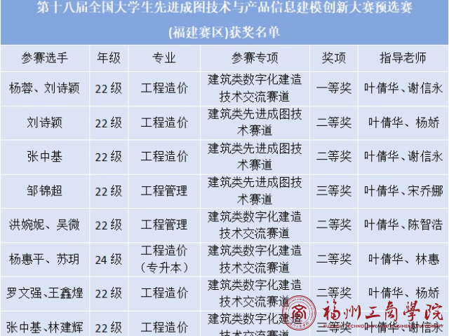 近日,我校ok138cn太阳集团工程造价和工程管理专业学生在第十八届全国大学生先进成图技术与产品信息建模创新大赛预选赛(福建赛区)中经过激烈角逐,参赛学生凭借扎实的专业技能与饱满热情,共获得一等奖1项、二等5项奖、三等奖2项的佳绩!